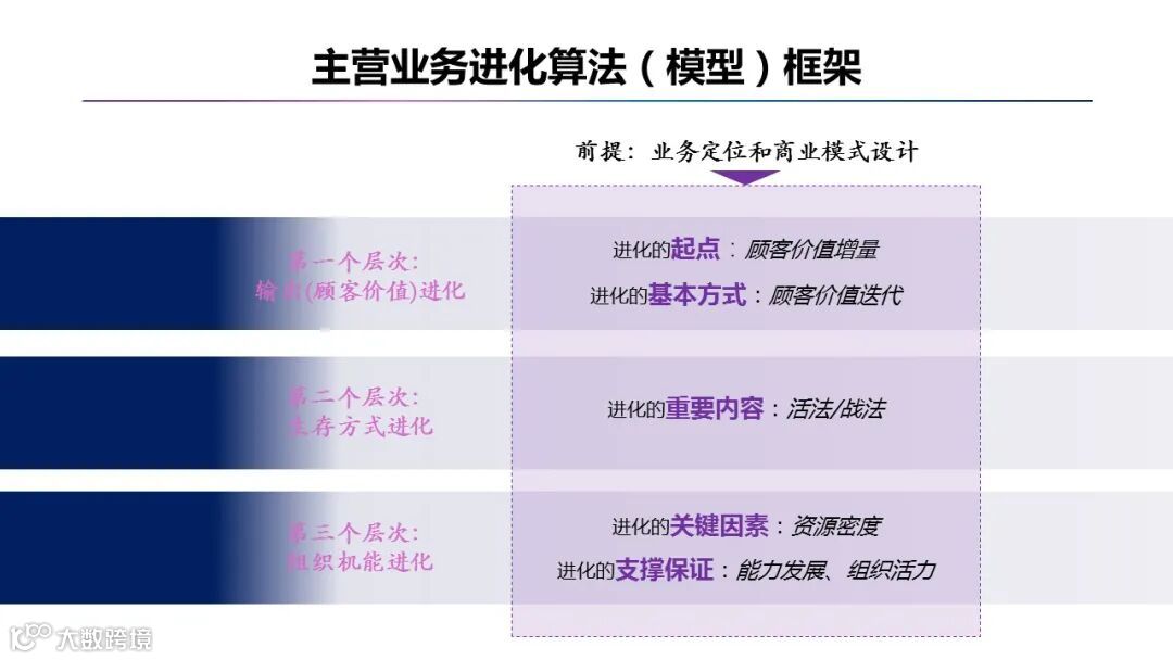 所以,一个主营业务的进化框架很简单,以增量为起点,以迭代为基本方式,进化的重要内容就是要找到一种竞争中的活法(也可以叫战法),进化的关键因素是资源密度(尤其是劳动密度),进化的保证和支撑因素是能力发展和组织活力提升。