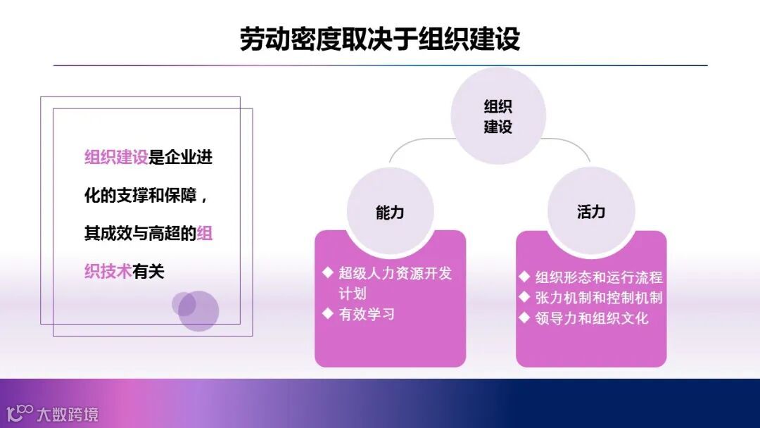 劳动密度取决于什么?劳动密度取决于组织建设。组织建设主要围绕两个方面:能力和活力,合起来叫动态竞争力。华为的奥秘其实就在这个地方。
