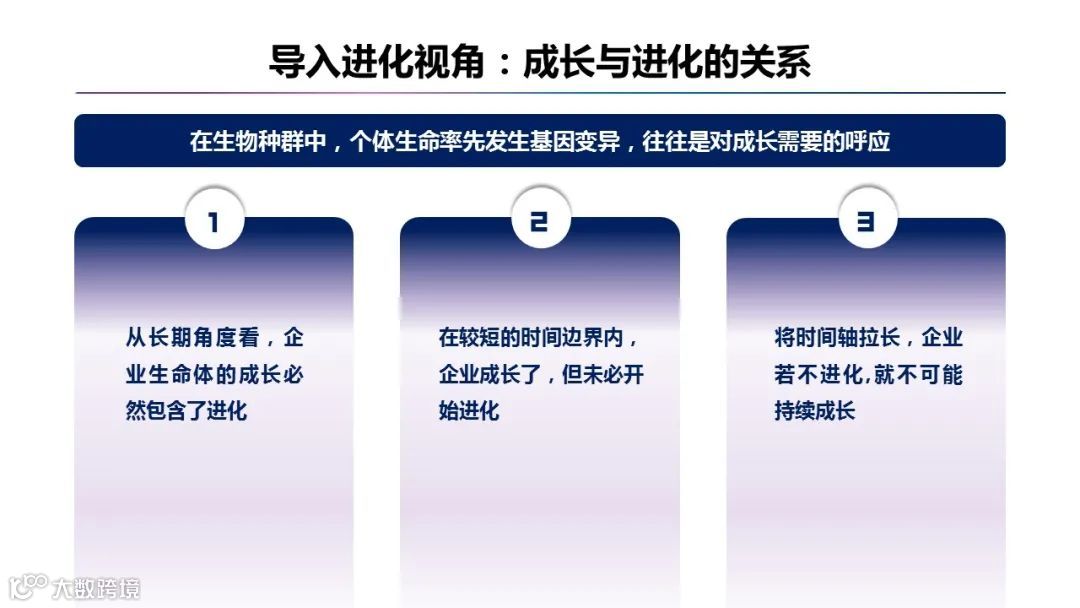 我们的研究的基本内容就是中国企业的成长。研究企业成长,为什么引入“进化”这个概念?因为在研究过程中发现,从长期视角、长周期看,进化等于成长,不进化就不能成长。