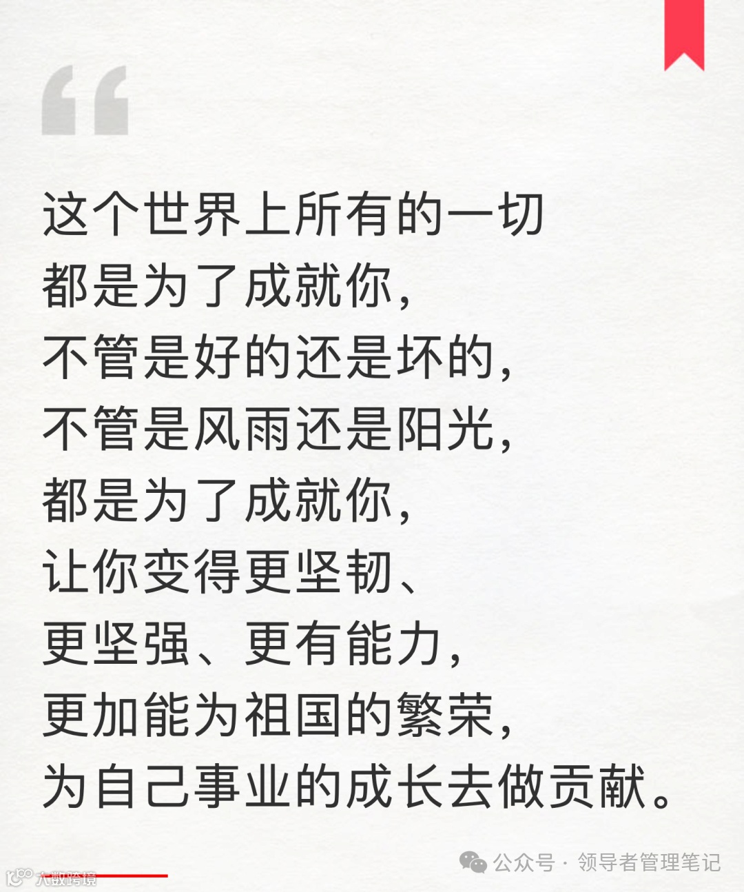 这个世界上所有的一切都是为了成就你,不管是好的还是坏的,不管是风雨还是阳光,都是为了成就你,让你变得更坚韧、更坚强、更有能力,更加能为祖国的繁荣,为自己事业的成长去做贡献。