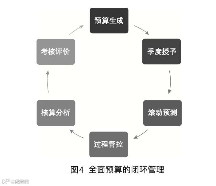 全面预算还要进行闭环管理,通过计划预算来牵引,通过核算对计划预算的执行情况进行评估和监控,以保障业务可持续发展,实现规避风险与敢于投资的平衡(见图-4)。