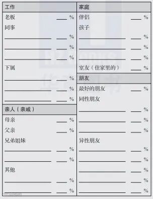 每个人都会有虚伪地倾听别人说话的时候。使用下表来评估你和你生命中重要的人们之间倾听的真伪程度,估算你自己的倾听中有多少是真正的倾听。
