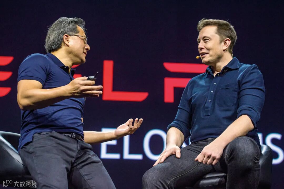 英伟达公司首席执行官黄仁勋(左)与特斯拉创始人马斯克出席GPU技术会议。
