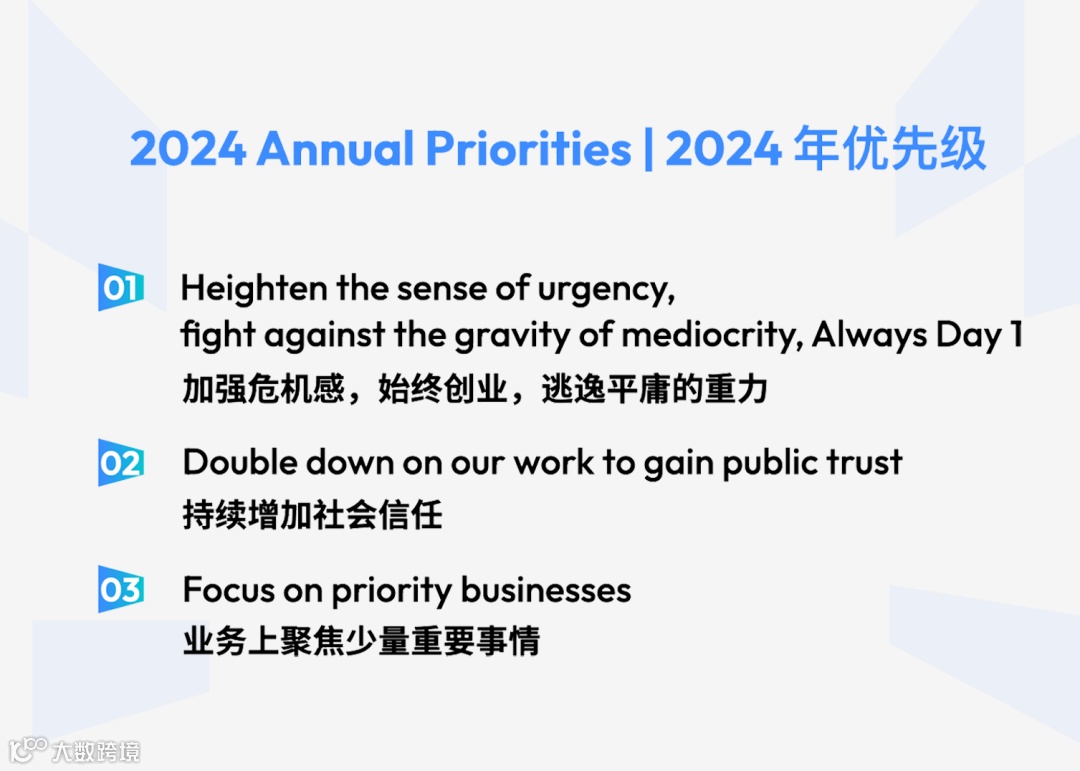 最后,梁汝波也和大家分享了他的2024年工作优先级,其中第一条就是“加强危机感,始终创业,逃逸平庸的重力”。其次是“持续增加社会信任”以及“业务上聚焦少量重要的事情”。