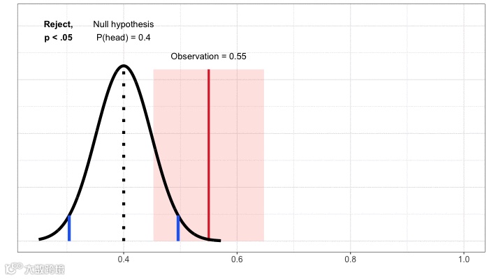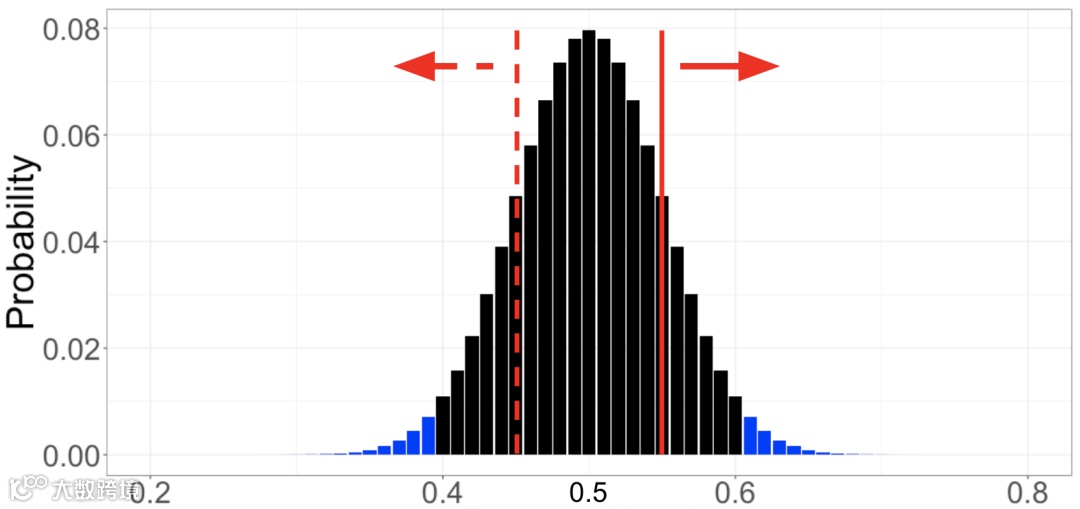 否定域。给测试建立决策规则的另一种方法是根据所谓的“拒绝域”——我们得出结论认为硬币是不均匀的一组值。为了计算拒绝域,我们再次假设原假设为真(硬币是均匀的),然后将拒绝域定义为概率总和不超过 0.05 的最不可能结果的集合。拒绝域由最极端的结果组成,前提是原假设是正确的——是拒绝原假设的证据最强的结果。如果观测值落在拒绝域内,我们就可以得出结论,存在统计上显著的证据表明硬币是不均匀的,并“拒绝”零假设。在那个抛硬币实验的情况下,拒绝域对应于观测到正面朝上的情况少于 40% 或超过 60%(如图 3 的蓝色阴影条所示)。我们称拒绝域的边界,本例情况下为正面朝向占比为 40% 与 60% ,为测试的临界值。