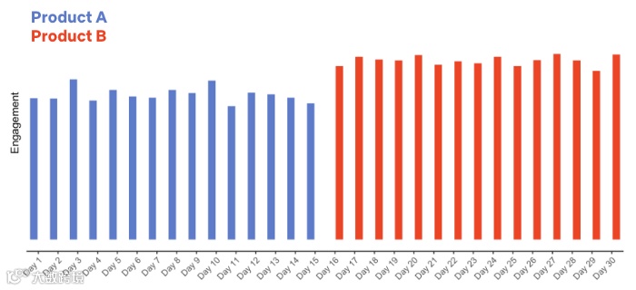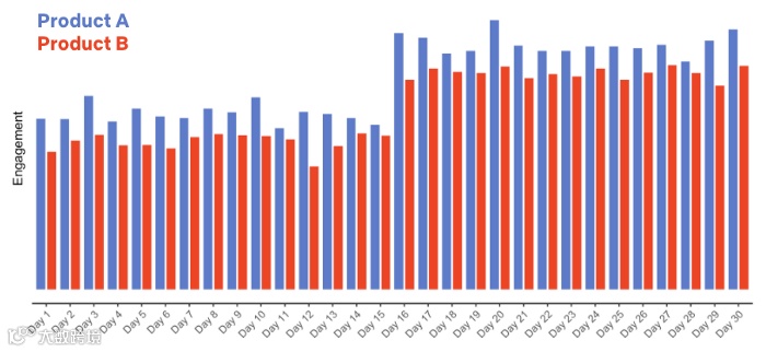 A/B 测试让我们可以做出因果陈述。我们仅向 B 组引入了倒置产品体验,并且由于我们是把会员随机分配到 A 组和 B 组的,因此两组之间的其他一切都保持不变。所以,我们可以得出倒置产品很可能导致参与度降低的结论(下一次再详细介绍)。
