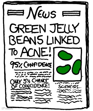 “合适的推理需要完整的报告与透明。” 就像我们在第 3 篇(误报与统计显著性)所说那样:,按照惯例,我们的实验将误报率设为 5%。在实践上,如果我们进行 20 次实验(比如评估 20 种颜色的果冻豆是不是都跟粉刺有关)的话,预计至少会得到一个显著结果——即便事实上每个实验的零假设均为真,并没有产生实际效果。这就是多重比较问题了,有很多方法可以控制整体的误报率,但我们不会在这里介绍。不过,最重要的是不仅要报告和跟踪产生了显著结果的测试结果,还要报告和跟踪那些没有产生显著结果的测试结果。