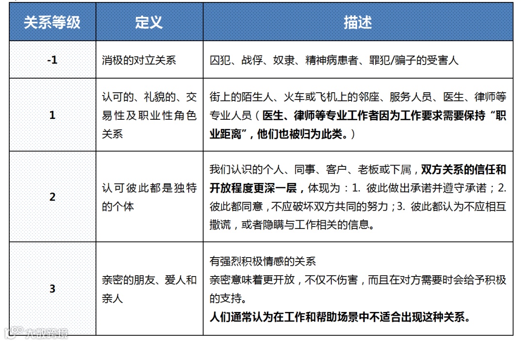 以下我们可以通过一个简单的表格来理解沙因教授对-1到3级不同关系的定义和描述。