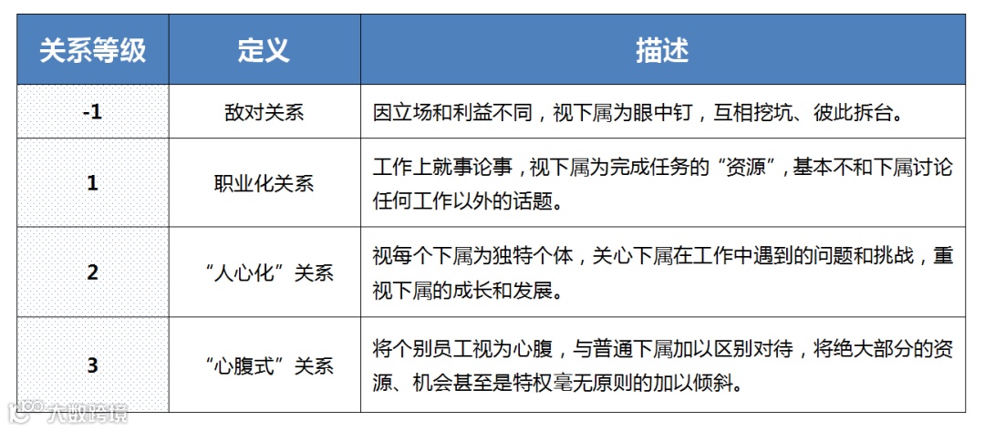 与沙因教授的关系等级略有不同,以下是我个人基于对中国职场上下级关系模式的观察,套用沙因教授-1到3的关系等级划分,对各等级重新进行定义与描述。