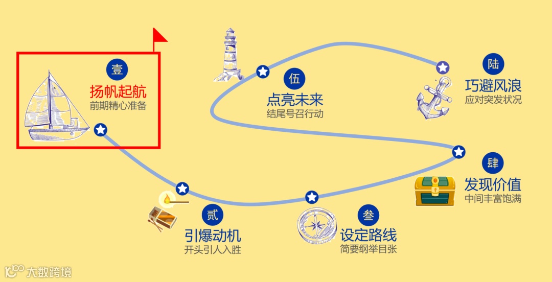 整条航线上有6站,1)做好扬帆起航的准备,2)引爆动机,开头引人入胜,3)设定路线,简要纲举目张,4)发现价值,打开你的百宝箱,让中间的内容丰富饱满,5)点亮未来,结尾号召行动,6)最后,要顺利完成航行,你还需要巧避风浪,应对突发状况。