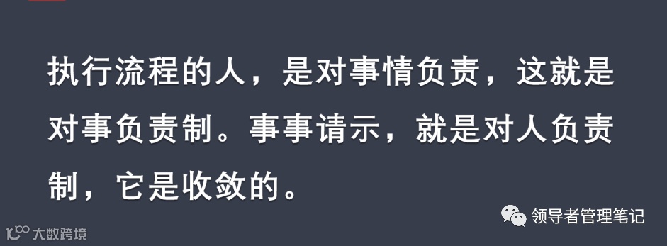 执行流程的人,是对事情负责,这就是对事负责制。事事请示,就是对人负责制,它是收敛的。我们要减化不必要确认的东西,要减少在管理中不必要、不重要的环节,否则公司怎么能高效运行呢?