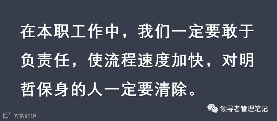 在本职工作中,我们一定要敢于负责任,使流程速度加快,对明哲保身的人一定要清除。华为给了员工很好的利益,于是有人说千万不要丢了这个位子,千万不要丢掉这个利益。