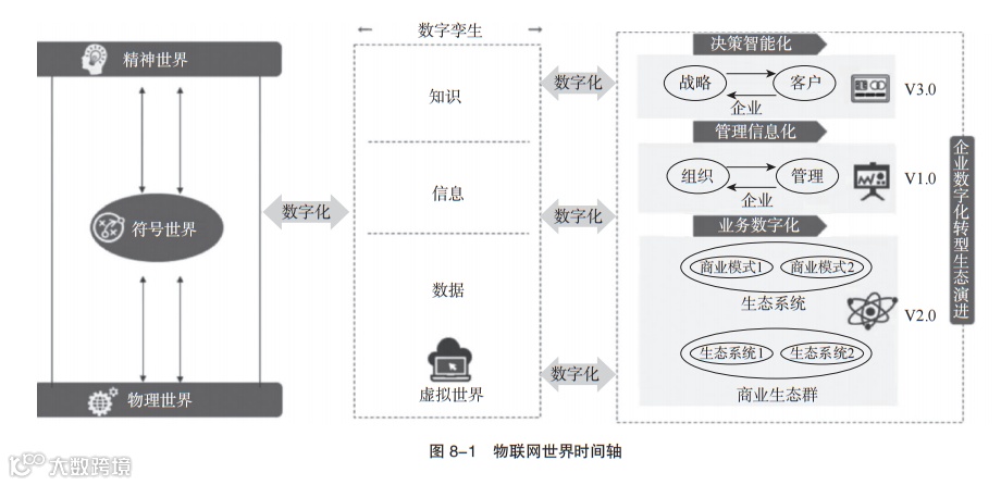 我们再从哲学家的视角看世界的变化,图 8-1 左边是哲学家讲的我们所在的三个世界。一个是物理世界,即无论我们每个人在不在,它都存在的世界;一个是我们每个人的精神世界;此外,在物理世界和精神世界之间,人类还创造了一个关于符号的世界,包括语言、文字、视频、图片、数学模型等,我们把这个叫作“符号世界”。