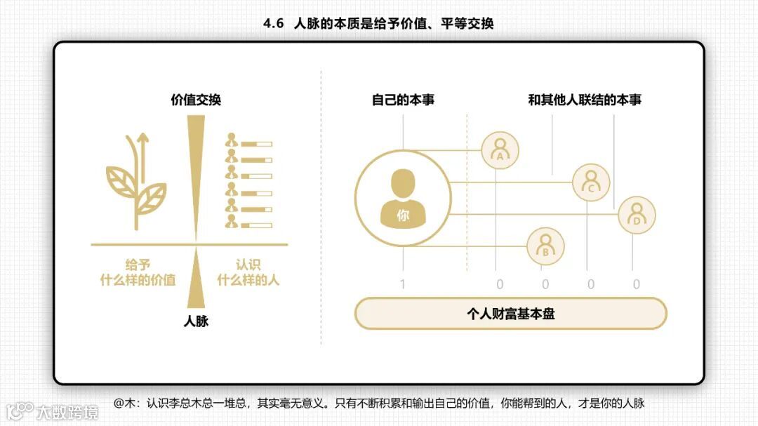 @木:认识李总木总一堆总,其实毫无意义。只有不断积累和输出自己的价值,你能帮到的人,才是你的人脉