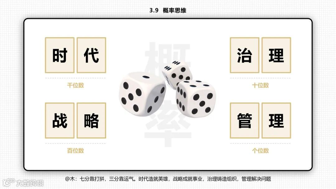 @木:七分靠打拼,三分靠运气。时代造就英雄,战略成就事业,治理铸造组织,管理解决问题