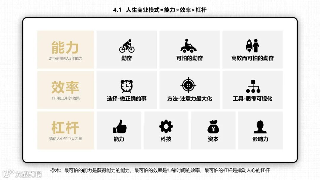 @木:最可怕的能力是获得能力的能力,最可怕的效率是伸缩时间的效率,最可怕的杠杆是撬动人心的杠杆