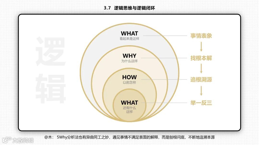@木:5Why分析法也有异曲同工之妙,遇见事情不满足表面的解释,而是刨根问底,不断地追溯本源