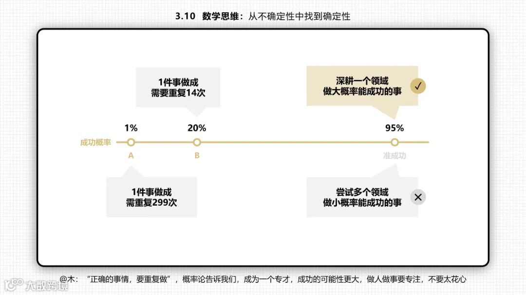 @木:“正确的事情,要重复做”,概率论告诉我们,成为一个专才,成功的可能性更大,做人做事要专注,不要太花心