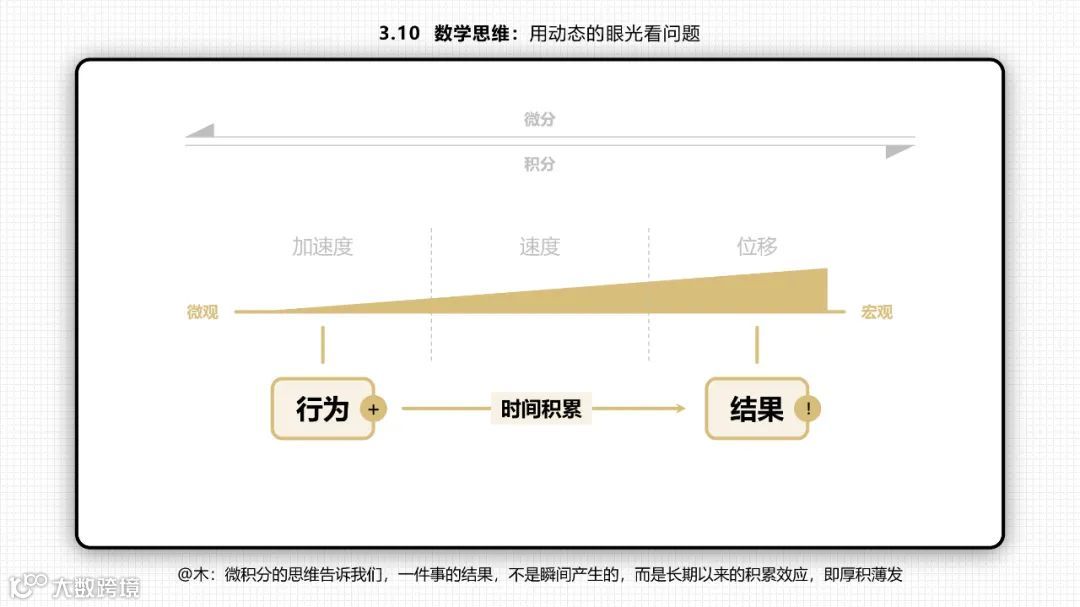 @木:微积分的思维告诉我们,一件事的结果,不是瞬间产生的,而是长期以来的积累效应,即厚积薄发