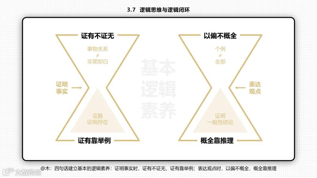 @木:四句话建立基本的逻辑素养:证明事实时,证有不证无,证有靠举例;表达观点时,以偏不概全,概全靠推理