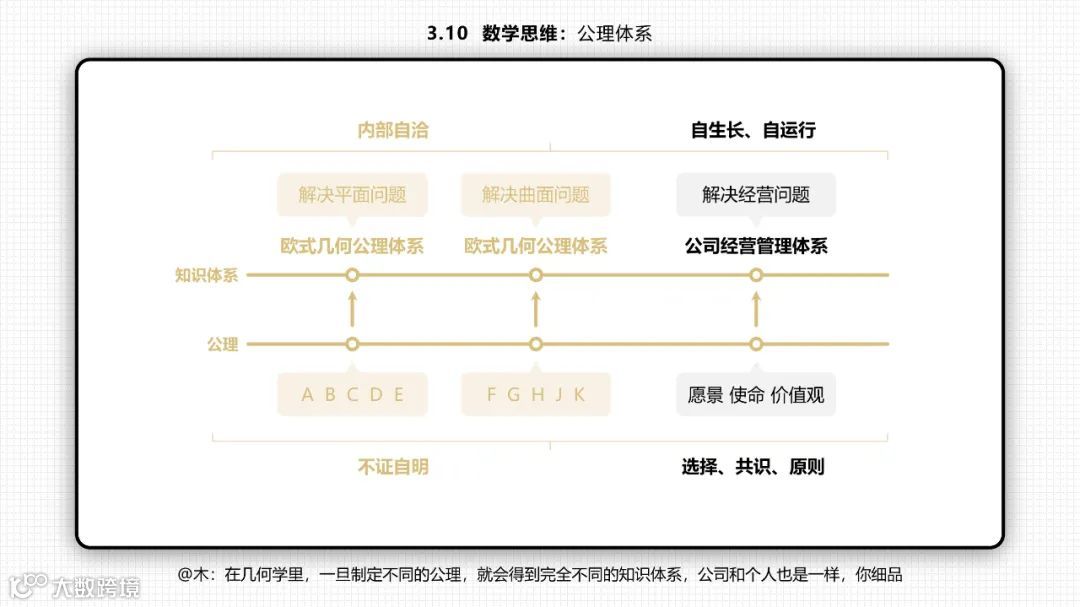@木:在几何学里,一旦制定不同的公理,就会得到完全不同的知识体系,公司和个人也是一样,你细品