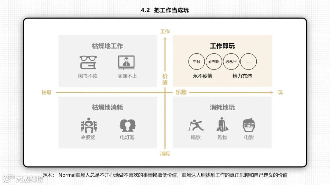 @木:Normal职场人总是不开心地做不喜欢的事情换取低价值,职场达人则找到工作的真正乐趣和自己定义的价值