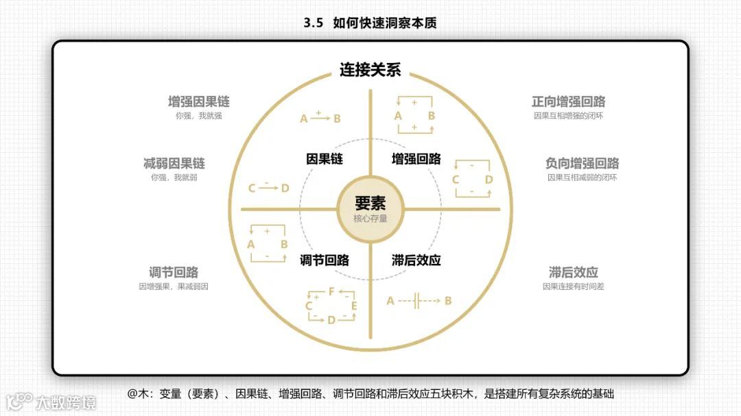 @木:变量(要素)、因果链、增强回路、调节回路和滞后效应五块积木,是搭建所有复杂系统的基础