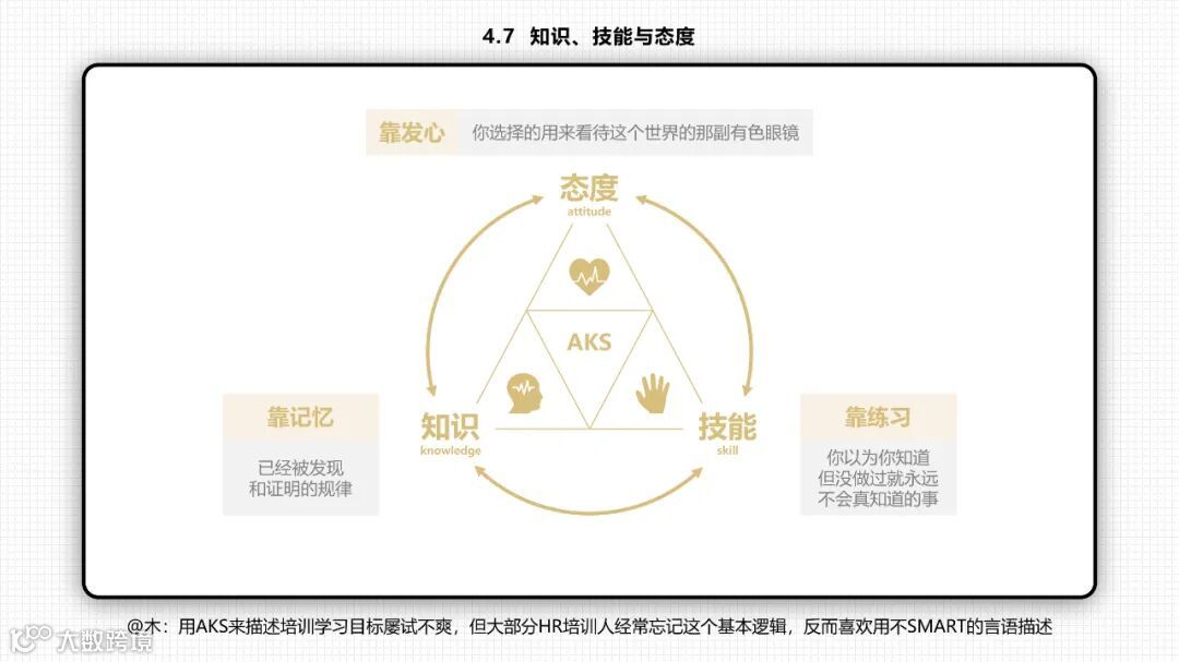 @木:用AKS来描述培训学习目标屡试不爽,但大部分HR培训人经常忘记这个基本逻辑,反而喜欢用不SMART的言语描述