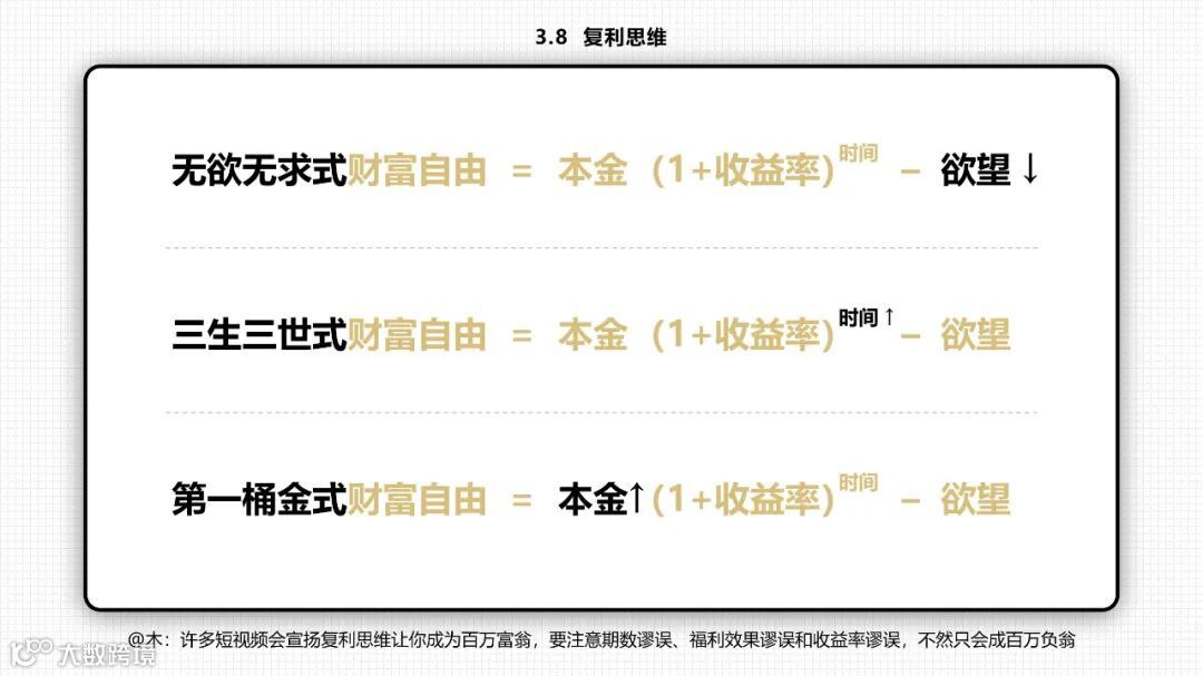 @木:许多短视频会宣扬复利思维让你成为百万富翁,要注意期数谬误、福利效果谬误和收益率谬误,不然只会成百万负翁