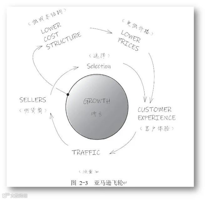 这个逻辑后来被具象地画成了“亚马逊飞轮”,这个飞轮的逻辑持续驱动亚马逊的发展,一直到现在。