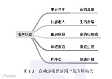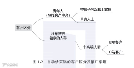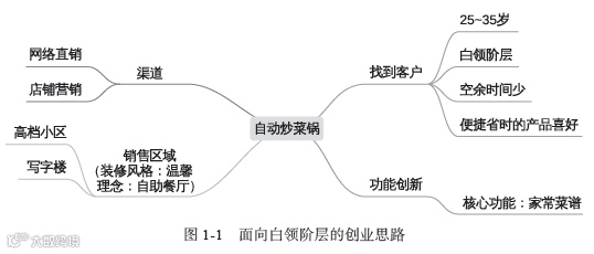 除此之外,我们还可以通过商场、电商平台(比如京东和天猫)做直销,把自动炒菜锅打造成一个送礼佳品,让用户买来送给朋友或家人。这位学员的创业思路如图1-1所示。