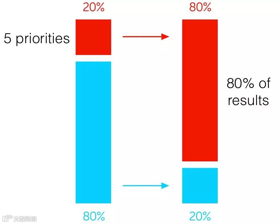 所以,如果你把25个优先级的清单缩小到5个优先级,你就可以再次运用80/20法则,专注于一个优先级,让你获得这5个优先级中80%的结果。