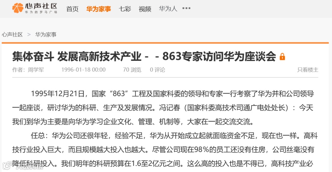 ►领导者说:★1995年12月21日,国家“863”工程及国家科委的领导和专家一行考察了华为并和公司领导一起座谈,研讨华为的科研、生产及发展情况。