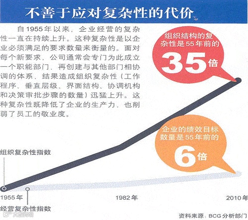 笔者供职的波士顿咨询公司根据对100多家欧美上市公司的全面考察,创建了一个“组织复杂性指数”(index of complicatedness),用以衡量组织的复杂程度。