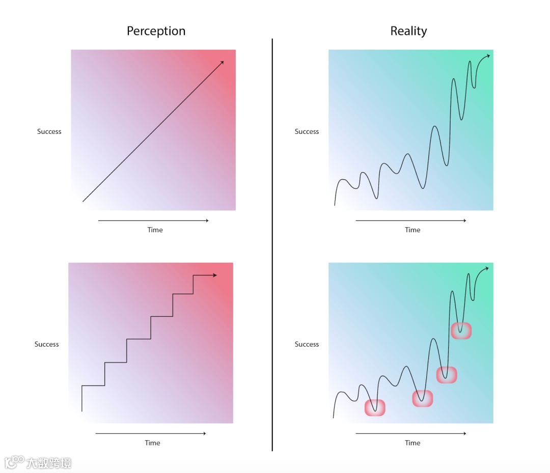 上图左边的曲线是我们以为的:可预测,线性的,直接反映我们所付出的努力。很少有成功是这样的。