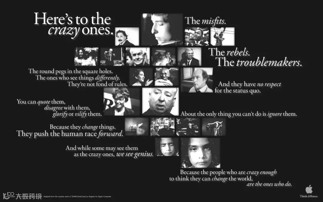 1997年,重新回归苹果公司后,乔布斯主导了苹果“非同凡想”系列广告,那段经典的广告词至今广为流传——