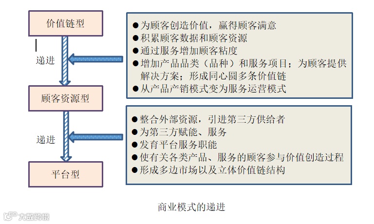 通常情况下,商业模式的递进是顺次的。也就是说,价值链型需先升级为顾客资源型,然后才有可能递进为平台型。下图是说明商业模式递进的路径。