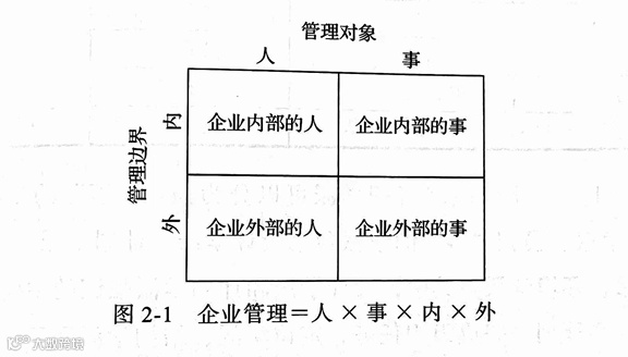 在信息化、网络化、智能化程度日益加深的今天,企业的“内”“外”边界和“人”“事”边界经常是模糊不清的,但用“人”和“事”、“内”和“外”两个维度进行分析,是有助于管理者简化战略思维,抓住管理核心的。我们可以用“企业管理=人×事×内×外”这个公式来思考企业的基本事项。