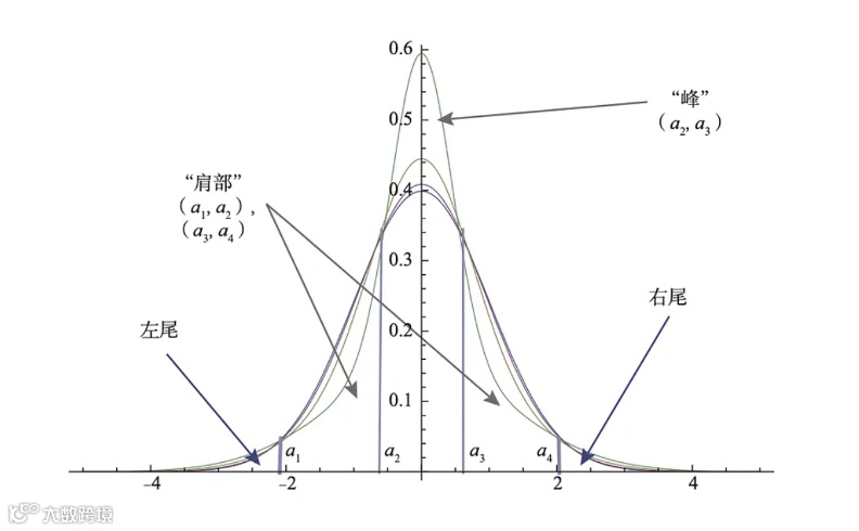 下图是一个很常见的关于概率分布的示意图。中间隆起来的部分我们叫“峰”,两侧是“肩部”和“左尾”和“右尾”,分别代表了不同的分布区间。