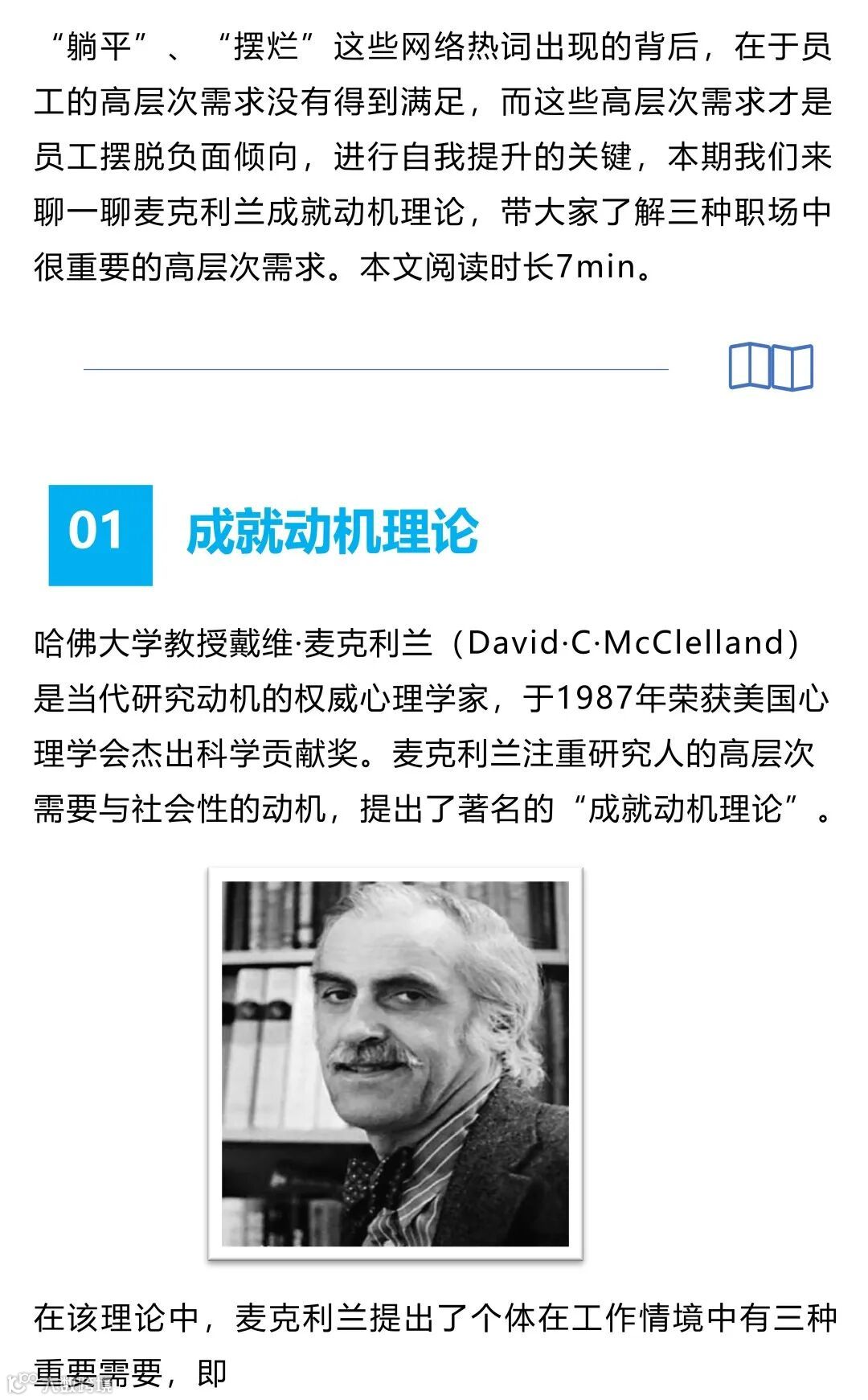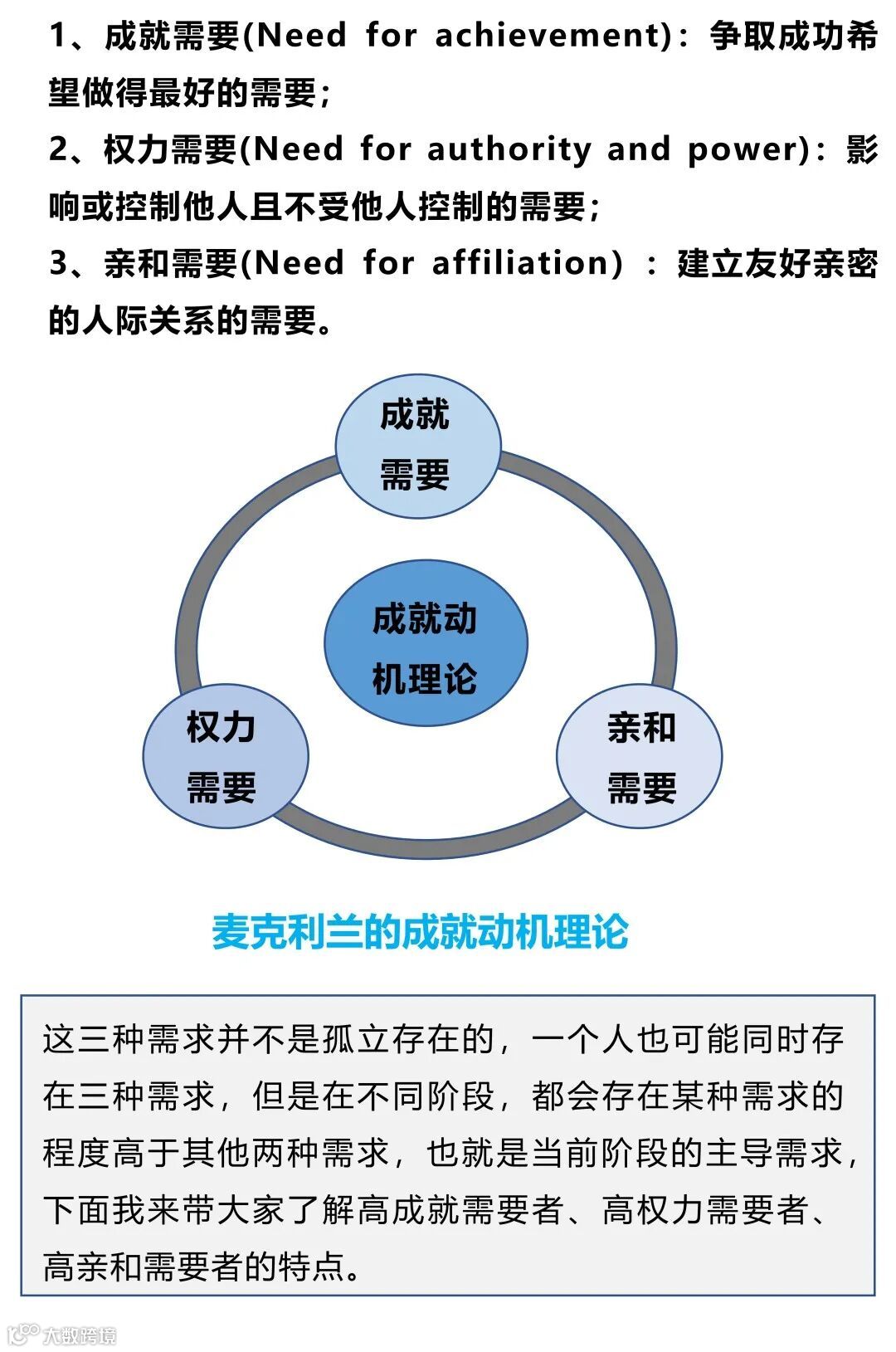 ►领导者说:★成就动机理论是美国哈佛大学教授戴维·麦克利兰(David·C·McClelland)通过对人的需求和动机进行研究,于50年代在一系列文章中提出的。麦克利兰把人的高层次需求归纳为对成就、权力和亲和的需求。他对这三种需求,特别是成就需求做了深入的研究。