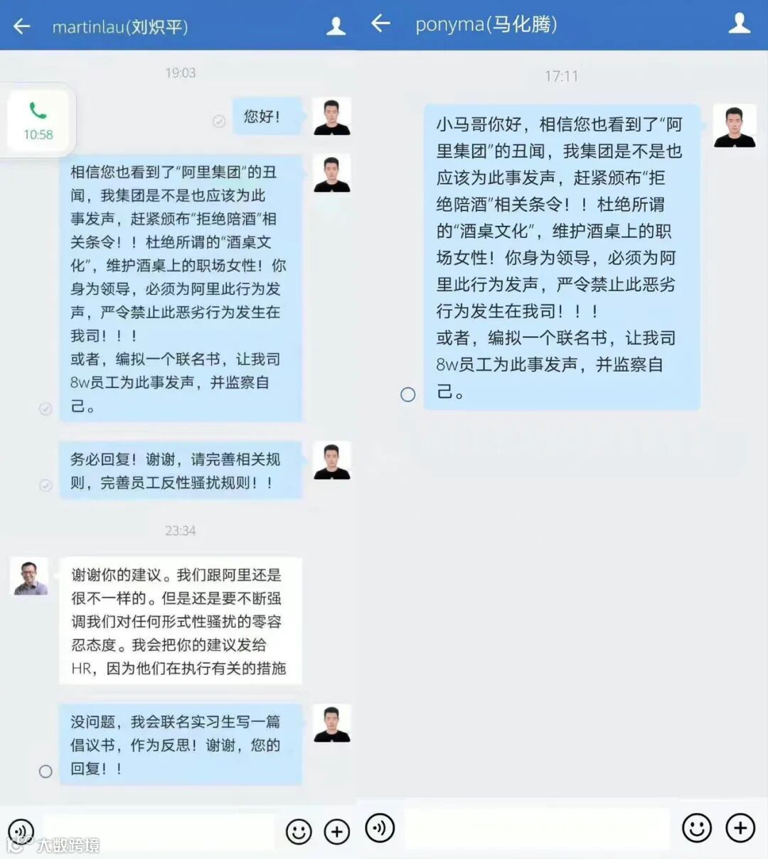 8月10日,网传腾讯一位实习生给CEO马化腾和总裁刘炽平发私信,要求“赶紧颁布拒绝陪酒相关条令”“你身为领导必须为此事发声”“务必回复”,还附上数个感叹号。