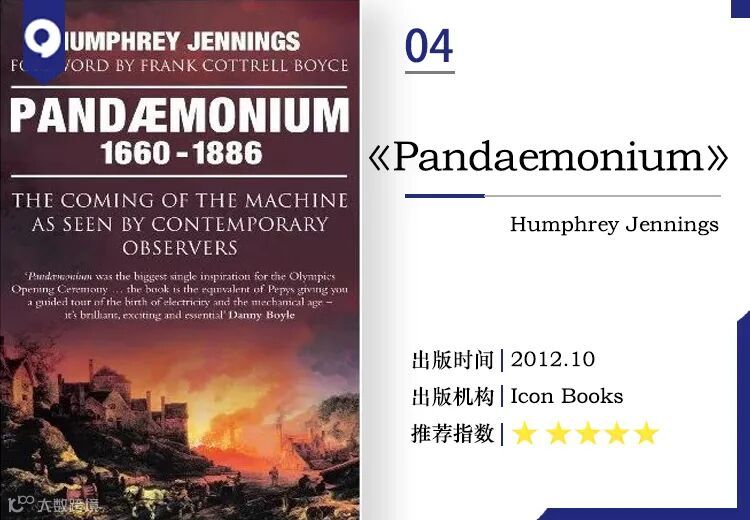 《Pandaemonium》追溯了英国机械时代的发展,并于2012年成为丹尼·博伊尔为伦敦奥运会电气化开幕式的灵感来源。它涵盖了1660年到1886年的历史,呈现了人类经历的丰富图景,包括路德教徒暴动和彼得卢大屠杀的目击报告,以及更加私人的儿童劳工、乌托邦社区、对自然环境的破坏、开创性的科学实验和铁路的到来等等。