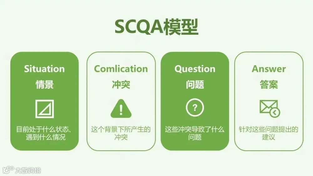 SCQA模型有4个部分组成,即Situation(情景),Complication(冲突),Question(疑问),Answer(答案)。