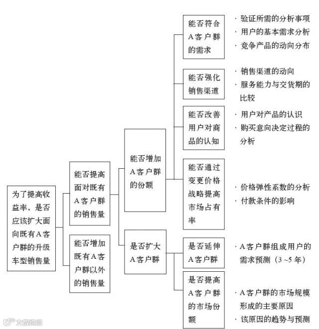 例:假设在验证“为了提高收益率,是否应该扩大面向既有A客户群的升级车型销售量”这一论点时,不漏不重地分解要点树,就可以发现需要验证的各个要素,包括市场扩大的可能性、对客户需求的把握,以及与销售渠道、与价格相关的要素等。