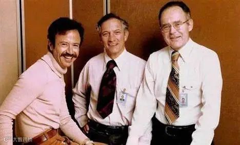 ▲(左一)戈登·摩尔,英特尔公司创始人之一,(中间)罗伯特·诺伊斯,仙童半导体公司和英特尔创始人