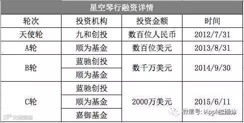 成立后第二个月后,星空琴行宣布获“百度七剑客”之一的王啸旗下的九合创投的数百万人民币天使轮融资;2013年8月,获得雷军旗下顺为资本数百万人民币A轮融资,2014年9月,获蓝驰创投,顺为资本数千万美元B轮融资;2015年6月,获嘉御基金领投,顺为资本和蓝驰创投跟投的2000万美元C轮融资。截止目前,公司经历了四轮融资,融资总额约为3.5亿元。
