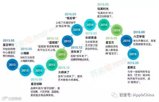 值得注意的是,在2015年9月,C轮融资发布之后,星空琴行还进行战略升级为“星空创联”,打出了六艺学馆,星空炫舞,蓝姐姐,美丽直达4个招牌,授课范围几乎涵盖了市面上主流的艺术培训,还搭建儿童电商平台,建立妈妈们的“健康美丽互动平台”。