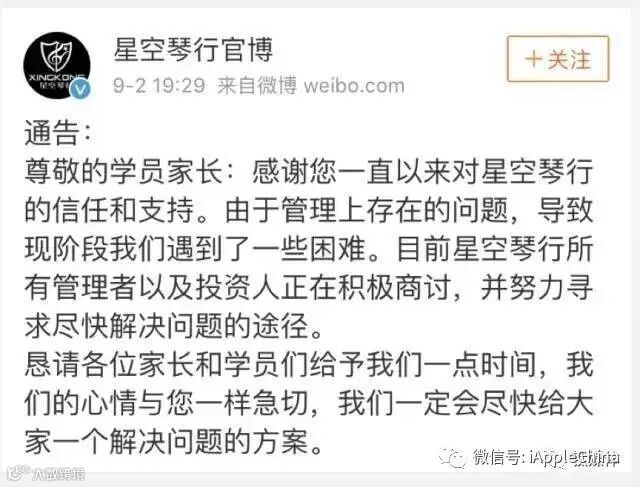 在事件发展多时之后,昨天晚间19点29分,星空终于在微博和公号上发声,微博认证为六艺星空(北京)文化传播有限公司 @星空琴行官博 微博发布通告称,由于管理上存在的问题,导致现阶段遇见困难,管理者正和投资人商讨解决方案,“恳请各位家长和学员们给予我们一点时间”。不过,经钛媒体查实,官博已经关闭评论区。