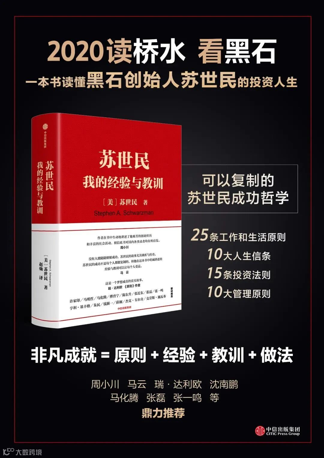 苏世民以其严谨的投资流程、创新的交易方式、多样的业务领域、做好每一件事而闻名。他以独树一帜的投资原则和管理原则带领着黑石集团一步步成为全球私募股权和房地产投资公司巨头。他花费一生时间去学习、去思考如何成功、如何实现梦想。