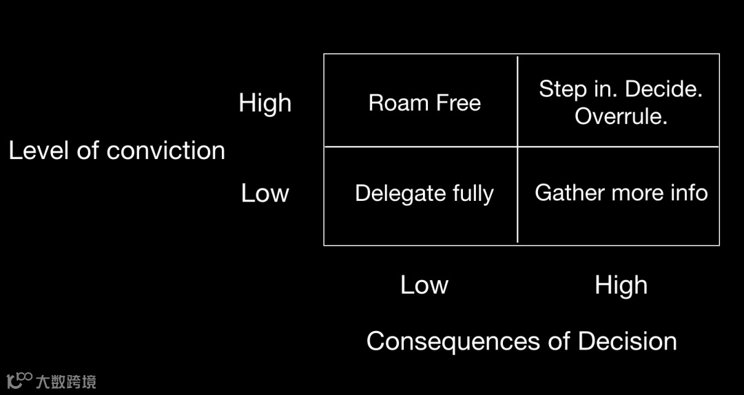 如果两者都很低,那么就把项目完全下放。如果你确信你知道完美的解决方案,但你的下属不同意,那么只要后果不严重,最好让他们去自己做。你应该让他们去实现自己的想法,自己学习判断。另一方面,如果一个决定的后果很严重,你需要有高度的信念,推翻你的队友的判断,或者你需要让他们去收集更多信息,直到你对一个决定有很高的信念。但你不能等到 100% 的信念,否则会行动太慢,理想的水平是 70% 左右。